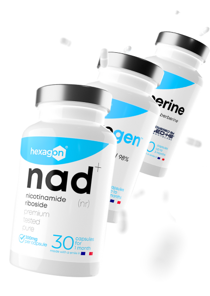 NAD+ Nicotinamide Riboside Chloride Hexagon® aide à lutter contre l'âge et la fatigue, ajoutez-le à votre routine pour booster votre taux de NAD+.